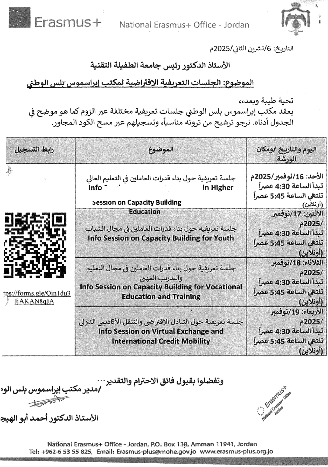 Home/Uni News/جلسات تعريفيه افتراضيه لمكتب ايراسموس بلس الوطني Uni News جلسات تعريفيه افتراضيه لمكتب ايراسموس بلس الوطني اعلان صادر عن مكتب العلاقات والمشاريع الدولية 2 hours ago 1 Less than a minute A+A-A Official TTU Pages 2 hours ago 1 Less than a minute Show More Share Facebook Twitter LinkedIn Skype Messenger Messenger WhatsApp Telegram Viber Line Share via Email Print