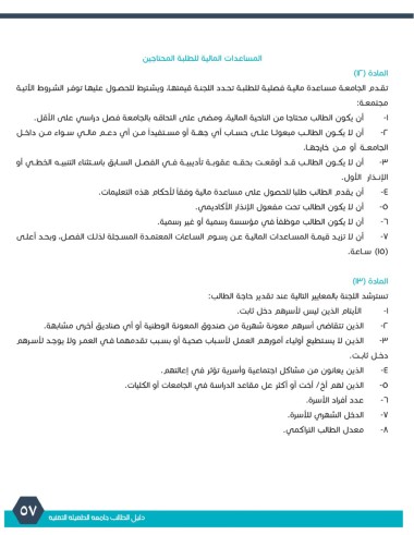 تقـدم الجامعـة مسـاعدة ماليـة فصليـة للطلبـة تحـدد اللجنـة قيمتهـا ،ويشـترط للحصـول عليهـا توفـر الشـروط الآتيـة