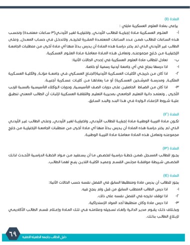 أ -العلــوم العســكرية مــادة إجباريــة للطالــب الأردنــي ,واختياريــة لغيــر الأردنــي( 3ســاعات معتمــدة) وتحســب